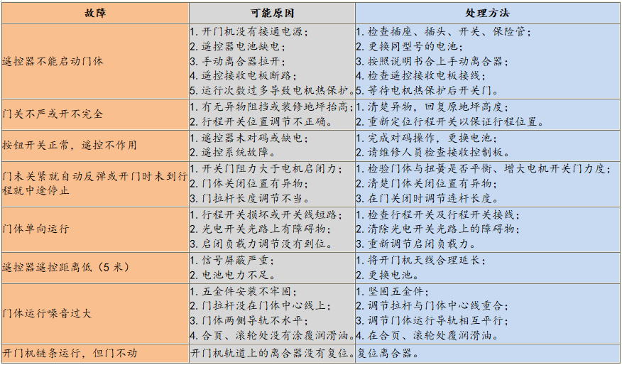 2、車庫門安裝時間久遠后可能出現一些故障,常規故障及可能原因和處理方法如下: